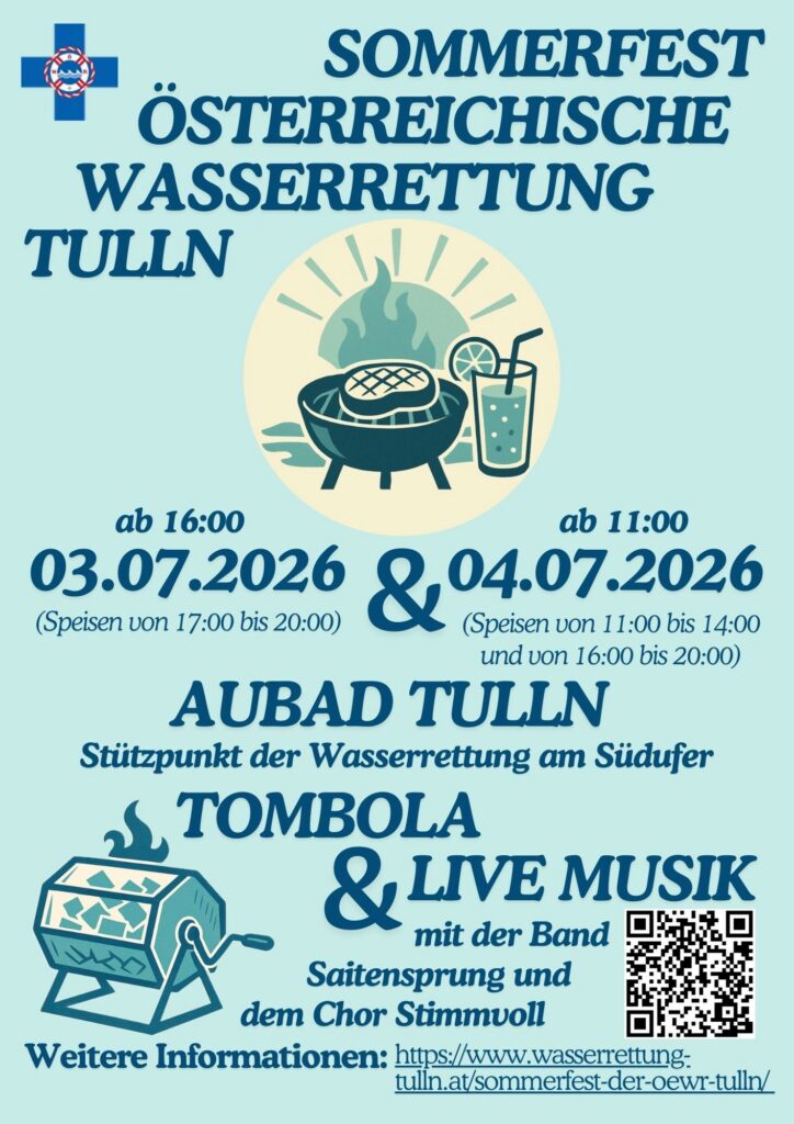 Am Freitag, 03.07.2026, ab 16:00 Uhr und am Samstag, 04.07.2026, ab 11:00 Uhr lädt die Österreichische Wasserrettung Tulln erneut zum Sommerfest ein.